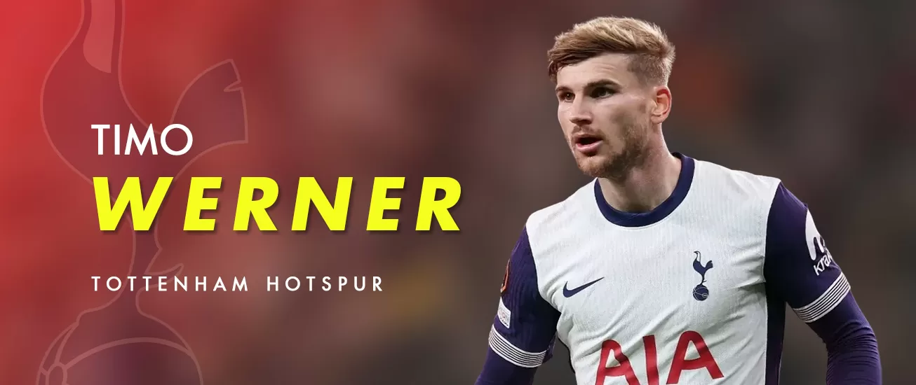 On 9 January 2024, Werner joined Premier League club Tottenham Hotspur on loan until the end of the 2023–24 season, with an option for the transfer to become permanent at the end of the season. Later that year in late May, Tottenham extended Werner's spell for a season-long loan with an option to buy clause in the region of £8.5 million.Werner scored his first goal of the 2024–25 season on 30 October in the fifth minute during a League Cup tie against Manchester City, which Tottenham went on to win 2–1 to advance to the quarterfinals.